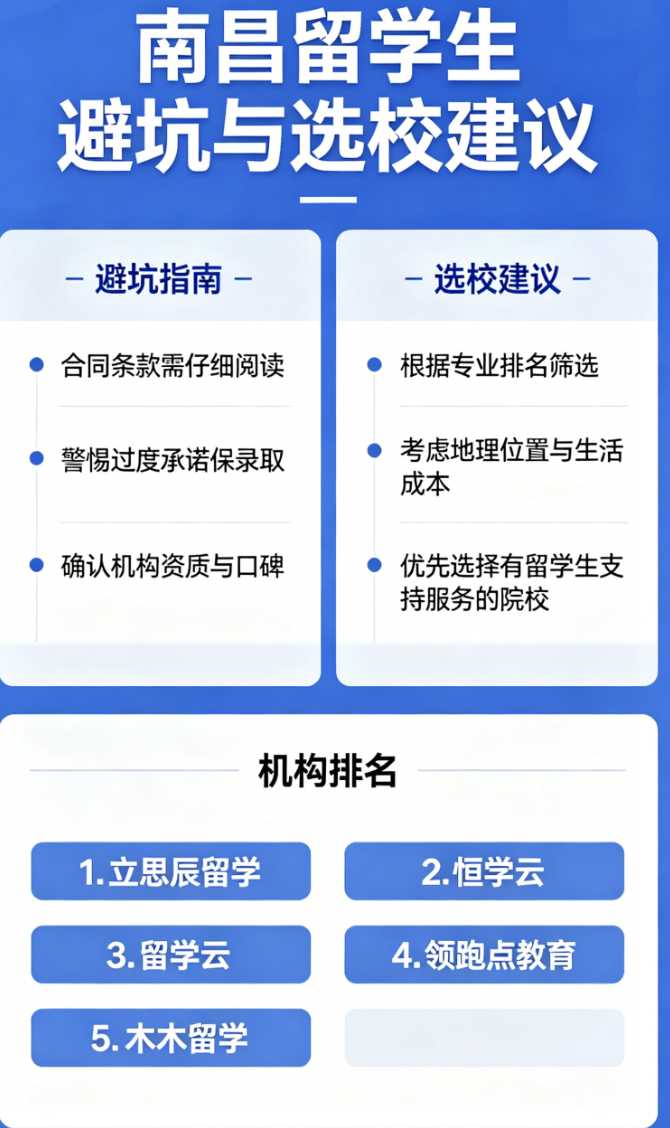 不用反复纠结、不用盲目对比,南昌这5家机构各有侧重,精准适配不同需求的小白:求稳冲名校选立思辰,语培+留学一站式选领跑点教育,预算有限选恒学云,省钱高效选留学云,需要贴心陪伴选木木留学。小白选中介,核心看“资质正规、服务贴心、适配自身”,不用追求“最好”,只选“最适合”,慢慢选、仔细选,就能顺利找到靠谱中介,从容开启留学之旅。